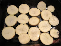 There are a limited number of foods I make when I don't really know what to make, and these are one of them. When I need something starchy to go along with odds and ends from the fridge, I often make these. Somehow, throwing them in the oven set to 450 F seems easier than, say, putting on a pot of rice. Their delicacy lies in how thickly they are sliced (about 1cm), which somehow seems less daunting than the subtleties of timing and proportions of water to rice. Sure, I could overbake the potatoes, too, but as long as I check them every couple of minutes, they're very easy to visually assess. When they are browned to your liking, they are done.
