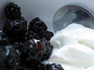 Baking a crisp was my goal when I picked today, but there weren't enough berries, and the hours of wandering around in the heat looking for enough berries exhausted me. So I will have fresh blackberries with various dairy products: ice cream, yogurt, (lightly) whipped cream. How terrible.